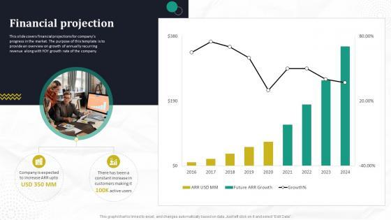 This slide covers financial projections for companys progress in the market. The purpose of this template is to provide an overview on growth of annually recurring revenue along with YOY growth rate of the company. Present like a pro with Financial Projection Automated Workflow Software Funding Pitch Deck For Company. Create beautiful presentations together with your team, using our easy-to-use presentation slides. Share your ideas in real-time and make changes on the fly by downloading our templates. So whether you are in the office, on the go, or in a remote location, you can stay in sync with your team and present your ideas with confidence. With Slidegeeks presentation got a whole lot easier. Grab these presentations today. This slide covers financial projections for companys progress in the market. The purpose of this template is to provide an overview on growth of annually recurring revenue along with YOY growth rate of the company.