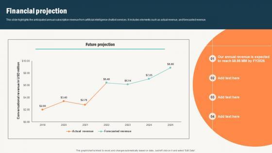 This slide highlights the anticipated annual subscription revenue from artificial intelligence chatbot services. It includes elements such as actual revenue, and forecasted revenue. Slidegeeks is here to make your presentations a breeze with Financial Projection Conversational Commerce Platform Investor With our easy to use and customizable templates, you can focus on delivering your ideas rather than worrying about formatting. With a variety of designs to choose from, you are sure to find one that suits your needs. And with animations and unique photos, illustrations, and fonts, you can make your presentation pop. So whether you are giving a sales pitch or presenting to the board, make sure to check out Slidegeeks first This slide highlights the anticipated annual subscription revenue from artificial intelligence chatbot services. It includes elements such as actual revenue, and forecasted revenue.
