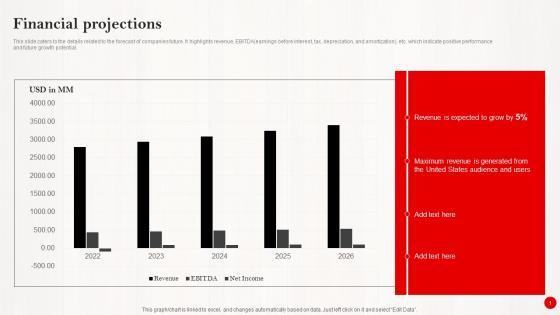 This slide caters to the details related to the forecast of companies future. It highlights revenue, EBITDAearnings before interest, tax, depreciation, and amortization, etc. which indicate positive performance and future growth potential. Slidegeeks is here to make your presentations a breeze with Financial Projections Investor Funding Pitch Deck For Pinterests Expansion Demonstration Pdf With our easy-to-use and customizable templates, you can focus on delivering your ideas rather than worrying about formatting. With a variety of designs to choose from, you are sure to find one that suits your needs. And with animations and unique photos, illustrations, and fonts, you can make your presentation pop. So whether you are giving a sales pitch or presenting to the board, make sure to check out Slidegeeks first. This slide caters to the details related to the forecast of companies future. It highlights revenue, EBITDAearnings before interest, tax, depreciation, and amortization, etc. which indicate positive performance and future growth potential.