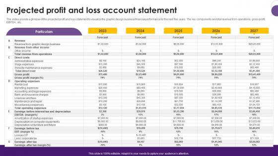 The slides provide a glimpse of the projected profit and loss statement to visualize the graphic design business financial performance for the next five years. The key components are total revenue from operations, gross profit, EBITDA, etc. Presenting this PowerPoint presentation, titled Creative Agency Business Plan Projected Profit And Loss Account Statement BP SS V, with topics curated by our researchers after extensive research. This editable presentation is available for immediate download and provides attractive features when used. Download now and captivate your audience. Presenting this Creative Agency Business Plan Projected Profit And Loss Account Statement BP SS V. Our researchers have carefully researched and created these slides with all aspects taken into consideration. This is a completely customizable Creative Agency Business Plan Projected Profit And Loss Account Statement BP SS V that is available for immediate downloading. Download now and make an impact on your audience. Highlight the attractive features available with our PPTs. The slides provide a glimpse of the projected profit and loss statement to visualize the graphic design business financial performance for the next five years. The key components are total revenue from operations, gross profit, EBITDA, etc.