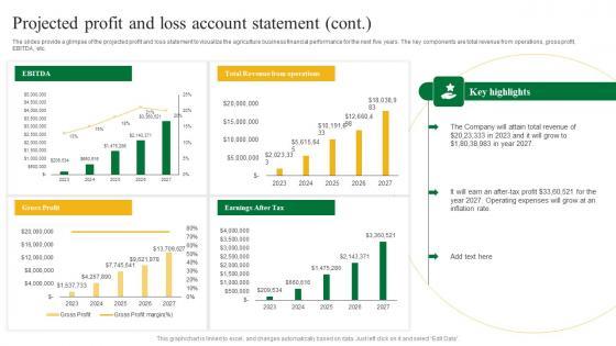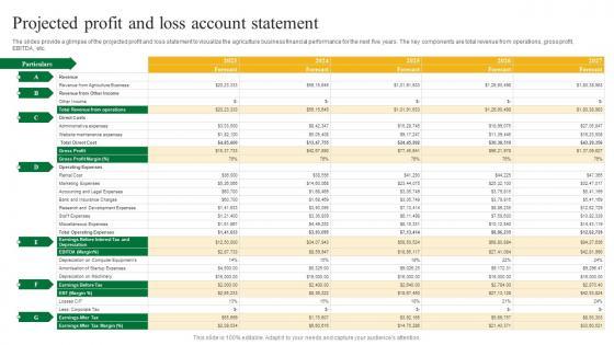 The slides provide a glimpse of the projected profit and loss statement to visualize the agriculture business financial performance for the next five years. The key components are total revenue from operations, gross profit, EBITDA, etc. Here you can discover an assortment of the finest PowerPoint and Google Slides templates. With these templates, you can create presentations for a variety of purposes while simultaneously providing your audience with an eye catching visual experience. Download Projected Profit And Loss Account Agriculture Business Plan Go To Market Strategy Inspiration Pdf to deliver an impeccable presentation. These templates will make your job of preparing presentations much quicker, yet still, maintain a high level of quality. Slidegeeks has experienced researchers who prepare these templates and write high quality content for you. Later on, you can personalize the content by editing the Projected Profit And Loss Account Agriculture Business Plan Go To Market Strategy Inspiration Pdf. The slides provide a glimpse of the projected profit and loss statement to visualize the agriculture business financial performance for the next five years. The key components are total revenue from operations, gross profit, EBITDA, etc.