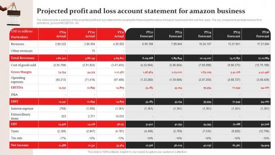The slides provide a overview of the projected profit and loss statement to visualize the financial performance of Amazon business for the next five years. The key components are total revenue from operations, gross profit, EBITDA, etc. Find a pre designed and impeccable Projected Profit And Loss Account Amazon Business Plan Go To Market Strategy Clipart Pdf. The templates can ace your presentation without additional effort. You can download these easy to edit presentation templates to make your presentation stand out from others. So, what are you waiting for Download the template from Slidegeeks today and give a unique touch to your presentation. The slides provide a overview of the projected profit and loss statement to visualize the financial performance of Amazon business for the next five years. The key components are total revenue from operations, gross profit, EBITDA, etc.