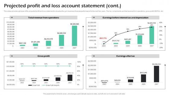 The slides provide a glimpse of the projected profit and loss statement to visualize the gym business financial performance for the next five years. The key components are total revenue from operations, gross profit, EBITDA, etc. Find a pre-designed and impeccable Projected Profit And Loss Account Statement Fitness Center Business Plan Sample Pdf The templates can ace your presentation without additional effort. You can download these easy-to-edit presentation templates to make your presentation stand out from others. So, what are you waiting for Download the template from Slidegeeks today and give a unique touch to your presentation. The slides provide a glimpse of the projected profit and loss statement to visualize the gym business financial performance for the next five years. The key components are total revenue from operations, gross profit, EBITDA, etc.