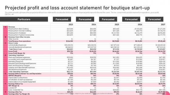 The slides provide a glimpse of the projected profit and loss statement to visualize the fashion boutiques financial performance for the next five years. The key components are total revenue from operations, gross profit, EBITDA, etc. Take your projects to the next level with our ultimate collection of Projected Profit And Loss Account Statement For Boutique Boutique Business Structure Pdf. Slidegeeks has designed a range of layouts that are perfect for representing task or activity duration, keeping track of all your deadlines at a glance. Tailor these designs to your exact needs and give them a truly corporate look with your own brand colors they will make your projects stand out from the rest The slides provide a glimpse of the projected profit and loss statement to visualize the fashion boutiques financial performance for the next five years. The key components are total revenue from operations, gross profit, EBITDA, etc.