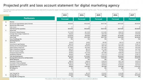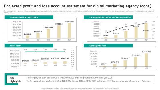 The slides provide a glimpse of the projected profit and loss statement to visualize the digital marketing agencys financial performance for the next five years. The key components are total revenue from operations, gross profit, EBITDA, etc. Slidegeeks has constructed Projected Profit And Loss Account Statement For Digital Marketing Business Guidelines Pdf after conducting extensive research and examination. These presentation templates are constantly being generated and modified based on user preferences and critiques from editors. Here, you will find the most attractive templates for a range of purposes while taking into account ratings and remarks from users regarding the content. This is an excellent jumping-off point to explore our content and will give new users an insight into our top-notch PowerPoint Templates. The slides provide a glimpse of the projected profit and loss statement to visualize the digital marketing agencys financial performance for the next five years. The key components are total revenue from operations, gross profit, EBITDA, etc.