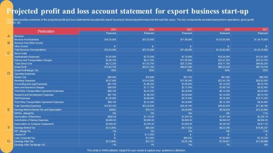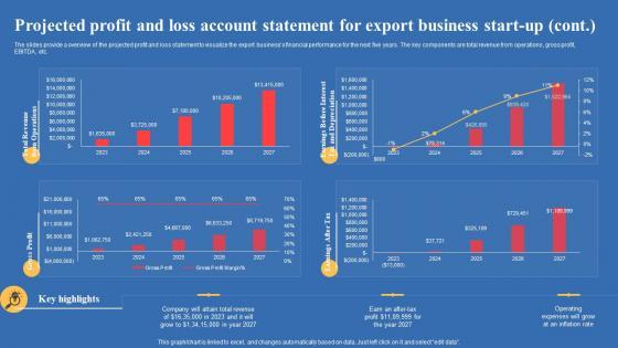 The slides provide a overview of the projected profit and loss statement to visualize the export businesss financial performance for the next five years. The key components are total revenue from operations, gross profit, This Projected Profit And Loss Account Statement For Export Business Export Business Plan Clipart Pdf from Slidegeeks makes it easy to present information on your topic with precision. It provides customization options, so you can make changes to the colors, design, graphics, or any other component to create a unique layout. It is also available for immediate download, so you can begin using it right away. Slidegeeks has done good research to ensure that you have everything you need to make your presentation stand out. Make a name out there for a brilliant performance. The slides provide a overview of the projected profit and loss statement to visualize the export businesss financial performance for the next five years. The key components are total revenue from operations, gross profit