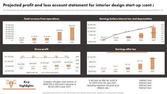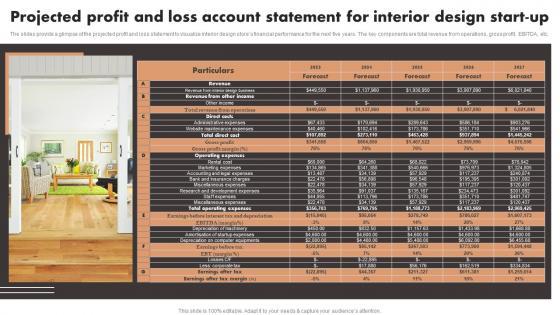 The slides provide a glimpse of the projected profit and loss statement to visualize interior design stores financial performance for the next five years. The key components are total revenue from operations, gross profit, EBITDA, etc. Present like a pro with Projected Profit And Loss Account Statement For Interior Design Luxury Interior Design Topics Pdf Create beautiful presentations together with your team, using our easy-to-use presentation slides. Share your ideas in real-time and make changes on the fly by downloading our templates. So whether you are in the office, on the go, or in a remote location, you can stay in sync with your team and present your ideas with confidence. With Slidegeeks presentation got a whole lot easier. Grab these presentations today. The slides provide a glimpse of the projected profit and loss statement to visualize interior design stores financial performance for the next five years. The key components are total revenue from operations, gross profit, EBITDA, etc.
