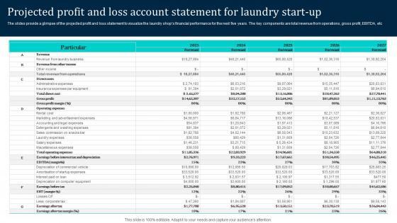 Here you can discover an assortment of the finest PowerPoint and Google Slides templates. With these templates, you can create presentations for a variety of purposes while simultaneously providing your audience with an eye catching visual experience. Download Projected Profit And Loss Account Statement On Demand Laundry Business Plan Summary Pdf to deliver an impeccable presentation. These templates will make your job of preparing presentations much quicker, yet still, maintain a high level of quality. Slidegeeks has experienced researchers who prepare these templates and write high quality content for you. Later on, you can personalize the content by editing the Projected Profit And Loss Account Statement On Demand Laundry Business Plan Summary Pdf The slides provide a glimpse of the projected profit and loss statement to visualize the laundry shops financial performance for the next five years. The key components are total revenue from operations, gross profit, EBITDA, etc.