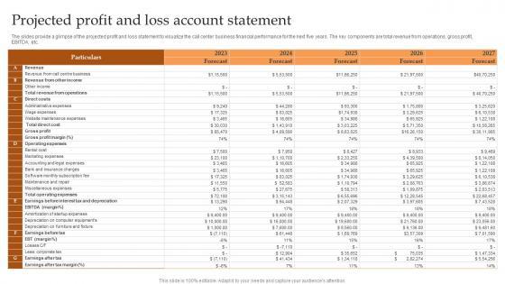 The slides provide a glimpse of the projected profit and loss statement to visualize the call center business financial performance for the next five years. The key components are total revenue from operations, gross profit, EBITDA, etc. Presenting this PowerPoint presentation, titled Projected Profit And Loss Account Statement BPO Center Business Plan Summary Pdf with topics curated by our researchers after extensive research. This editable presentation is available for immediate download and provides attractive features when used. Download now and captivate your audience. Presenting this Projected Profit And Loss Account Statement BPO Center Business Plan Summary Pdf Our researchers have carefully researched and created these slides with all aspects taken into consideration. This is a completely customizable Projected Profit And Loss Account Statement BPO Center Business Plan Summary Pdf that is available for immediate downloading. Download now and make an impact on your audience. Highlight the attractive features available with our PPTs. The slides provide a glimpse of the projected profit and loss statement to visualize the call center business financial performance for the next five years. The key components are total revenue from operations, gross profit, EBITDA, etc.
