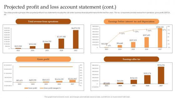 The slides provide a glimpse of the projected profit and loss statement to visualize the call center business financial performance for the next five years. The key components are total revenue from operations, gross profit, EBITDA, etc. Slidegeeks is one of the best resources for PowerPoint templates. You can download easily and regulate Projected Profit And Loss Account Statement IT And Tech Support Business Pictures Pdf for your personal presentations from our wonderful collection. A few clicks is all it takes to discover and get the most relevant and appropriate templates. Use our Templates to add a unique zing and appeal to your presentation and meetings. All the slides are easy to edit and you can use them even for advertisement purposes. The slides provide a glimpse of the projected profit and loss statement to visualize the call center business financial performance for the next five years. The key components are total revenue from operations, gross profit, EBITDA, etc.