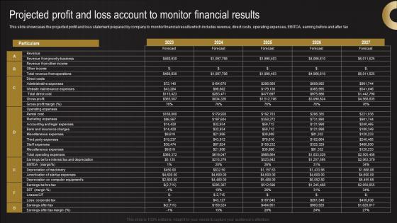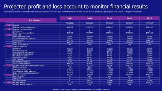 This slide showcases the projected profit and loss statement prepared by company to monitor financial results which includes revenue, direct costs, operating expenses, EBITDA, earning before and after tax Slidegeeks is here to make your presentations a breeze with Projected Profit And Loss Account To Monitor Financial Results Jewelry Business Plan Microsoft Pdf With our easy-to-use and customizable templates, you can focus on delivering your ideas rather than worrying about formatting. With a variety of designs to choose from, you are sure to find one that suits your needs. And with animations and unique photos, illustrations, and fonts, you can make your presentation pop. So whether you are giving a sales pitch or presenting to the board, make sure to check out Slidegeeks first. This slide showcases the projected profit and loss statement prepared by company to monitor financial results which includes revenue, direct costs, operating expenses, EBITDA, earning before and after tax