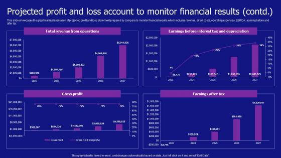 This slide showcases the graphical representation of projected profit and loss statement prepared by company to monitor financial results which includes revenue, direct costs, operating expenses, EBITDA, earning before and after tax. Here you can discover an assortment of the finest PowerPoint and Google Slides templates. With these templates, you can create presentations for a variety of purposes while simultaneously providing your audience with an eye-catching visual experience. Download Spa Resort Business Plan Projected Profit And Loss Account To Monitor Financial Results BP SS V to deliver an impeccable presentation. These templates will make your job of preparing presentations much quicker, yet still, maintain a high level of quality. Slidegeeks has experienced researchers who prepare these templates and write high-quality content for you. Later on, you can personalize the content by editing the Spa Resort Business Plan Projected Profit And Loss Account To Monitor Financial Results BP SS V. This slide showcases the graphical representation of projected profit and loss statement prepared by company to monitor financial results which includes revenue, direct costs, operating expenses, EBITDA, earning before and after tax.