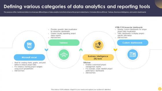 The purpose of the mentioned slide is to showcase different types of data analytics tools that enhance the project-related tasks. It includes Microsoft Excel, Tableau, Business Intelligence, and custom dashboards. Slidegeeks is here to make your presentations a breeze with Digital Project Management Strategies Defining Various Categories Of Data Analytics And Reporting With our easy-to-use and customizable templates, you can focus on delivering your ideas rather than worrying about formatting. With a variety of designs to choose from, you are sure to find one that suits your needs. And with animations and unique photos, illustrations, and fonts, you can make your presentation pop. So whether you are giving a sales pitch or presenting to the board, make sure to check out Slidegeeks first The purpose of the mentioned slide is to showcase different types of data analytics tools that enhance the project-related tasks. It includes Microsoft Excel, Tableau, Business Intelligence, and custom dashboards.