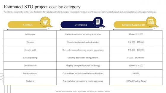 The following slide provides brief overview of initial coin offering budget estimation by category. It includes elements such as white paper development, website, security audit, exchange listing, legal charges, marketing, etc. Formulating a presentation can take up a lot of effort and time, so the content and message should always be the primary focus. The visuals of the PowerPoint can enhance the presenters message, so our Estimated STO Project Cost By Category Exploring Investment Opportunities Designs Pdf was created to help save time. Instead of worrying about the design, the presenter can concentrate on the message while our designers work on creating the ideal templates for whatever situation is needed. Slidegeeks has experts for everything from amazing designs to valuable content, we have put everything into Estimated Sto Project Cost By Category Exploring Investment Opportunities Designs Pdf The following slide provides brief overview of initial coin offering budget estimation by category. It includes elements such as white paper development, website, security audit, exchange listing, legal charges, marketing, etc.
