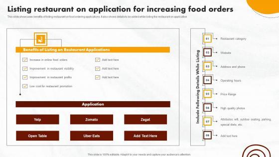 This slide showcases benefits of listing restaurant on food ordering applications. It also shows details to be added while listing the restaurant on application Are you in need of a template that can accommodate all of your creative concepts This one is crafted professionally and can be altered to fit any style. Use it with Google Slides or PowerPoint. Include striking photographs, symbols, depictions, and other visuals. Fill, move around, or remove text boxes as desired. Test out color palettes and font mixtures. Edit and save your work, or work with colleagues. Download Marketing Initiatives To Promote Fast Food Cafe Hosting Events In Restaurant For Awareness Portrait PDF and observe how to make your presentation outstanding. Give an impeccable presentation to your group and make your presentation unforgettable.