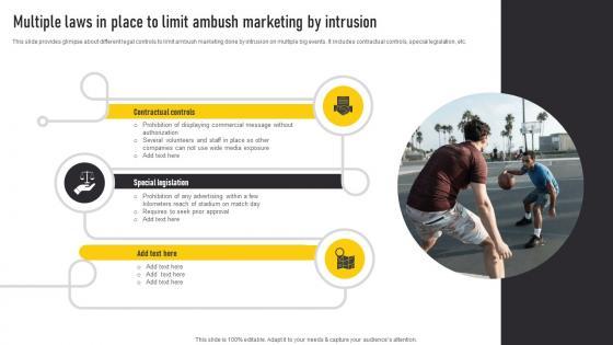 This slide provides glimpse about different legal controls to limit ambush marketing done by intrusion on multiple big events. It includes contractual controls, special legislation, etc. The Multiple Laws In Place To Limit Ambush Automate Guerrilla Promotional Slides Pdf is a compilation of the most recent design trends as a series of slides. It is suitable for any subject or industry presentation, containing attractive visuals and photo spots for businesses to clearly express their messages. This template contains a variety of slides for the user to input data, such as structures to contrast two elements, bullet points, and slides for written information. Slidegeeks is prepared to create an impression. This slide provides glimpse about different legal controls to limit ambush marketing done by intrusion on multiple big events. It includes contractual controls, special legislation, etc.