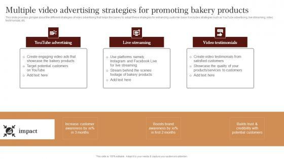 This slide provides glimpse about the different strategies of video advertising that helps the bakery to adopt these strategies for enhancing customer base. It includes strategies such as YouTube advertising, live streaming, video testimonials, etc.Make sure to capture your audiences attention in your business displays with our gratis customizable Multiple Video Advertising Strategies For Promoting Strategic Advertising Plan For Bakehouse Elements Pdf. These are great for business strategies, office conferences, capital raising or task suggestions. If you desire to acquire more customers for your tech business and ensure they stay satisfied, create your own sales presentation with these plain slides. This slide provides glimpse about the different strategies of video advertising that helps the bakery to adopt these strategies for enhancing customer base. It includes strategies such as YouTube advertising, live streaming, video testimonials, etc.