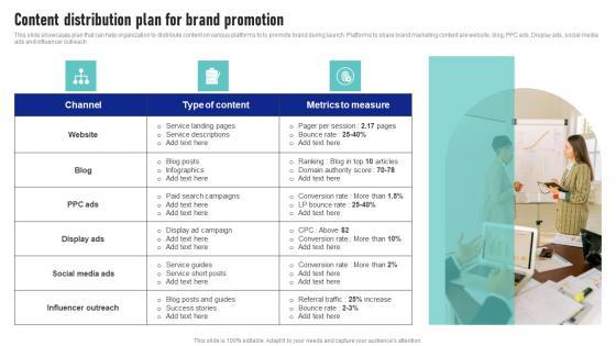 This slide showcases plan that can help organization to distribute content on various platforms to to promote brand during launch. Platforms to share brand marketing content are website, blog, PPC ads, Display ads, social media ads and influencer outreach If your project calls for a presentation, then Slidegeeks is your go-to partner because we have professionally designed, easy-to-edit templates that are perfect for any presentation. After downloading, you can easily edit Content Distribution Plan For Brand Promotion Launching New Product Brand Guidelines Pdf and make the changes accordingly. You can rearrange slides or fill them with different images. Check out all the handy templates This slide showcases plan that can help organization to distribute content on various platforms to to promote brand during launch. Platforms to share brand marketing content are website, blog, PPC ads, Display ads, social media ads and influencer outreach