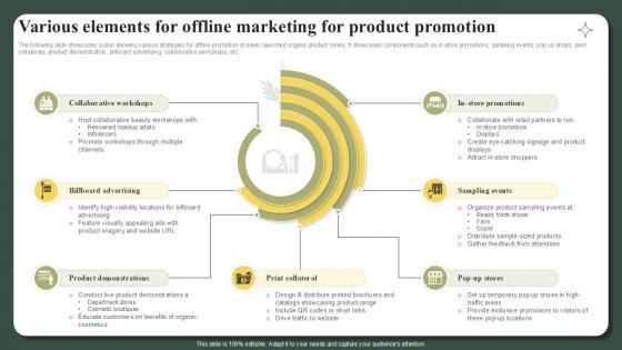 The following slide showcases a plan showing various strategies for offline promotion of newly launched organic product series. It showcases components such as in store promotions, sampling events, pop up shops, print collaterals, product demonstration, billboard advertising, collaborative workshops, etc. This Various Elements For Offline Marketing For Product Promotion Successful Launch Ppt Template from Slidegeeks makes it easy to present information on your topic with precision. It provides customization options, so you can make changes to the colors, design, graphics, or any other component to create a unique layout. It is also available for immediate download, so you can begin using it right away. Slidegeeks has done good research to ensure that you have everything you need to make your presentation stand out. Make a name out there for a brilliant performance. The following slide showcases a plan showing various strategies for offline promotion of newly launched organic product series. It showcases components such as in store promotions, sampling events, pop up shops, print collaterals, product demonstration, billboard advertising, collaborative workshops, etc.