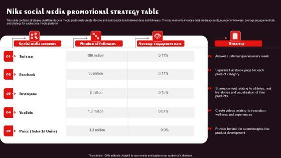 This slide contains strategies on different social media platforms to create lifestyle and build social bond between fans and followers . The key elements include social media accounts, number of followers, average engagement rate and strategy for each social media platform.Pitch your topic with ease and precision using this Nike Social Media Promotional Strategy Table Icons Pdf This layout presents information on Answer Customer Queries, Wellness Experiences, Product Development It is also available for immediate download and adjustment. So, changes can be made in the color, design, graphics or any other component to create a unique layout. This slide contains strategies on different social media platforms to create lifestyle and build social bond between fans and followers . The key elements include social media accounts, number of followers, average engagement rate and strategy for each social media platform.