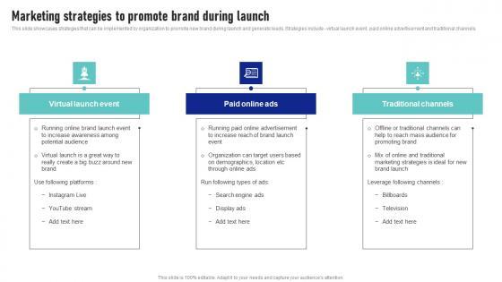 This slide showcases strategies that can be implemented by organization to promote new brand during launch and generate leads. Strategies include virtual launch event, paid online advertisement and traditional channels Retrieve professionally designed Marketing Strategies To Promote Brand During Launch Launching New Product Brand Themes Pdf to effectively convey your message and captivate your listeners. Save time by selecting pre-made slideshows that are appropriate for various topics, from business to educational purposes. These themes come in many different styles, from creative to corporate, and all of them are easily adjustable and can be edited quickly. Access them as PowerPoint templates or as Google Slides themes. You do not have to go on a hunt for the perfect presentation because Slidegeeks got you covered from everywhere. This slide showcases strategies that can be implemented by organization to promote new brand during launch and generate leads. Strategies include virtual launch event, paid online advertisement and traditional channels