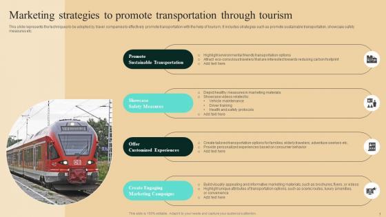 This slide represents the techniques to be adopted by travel companies to effectively promote transportation with the help of tourism. It includes strategies such as promote sustainable transportation, showcase safety measures etc. Do you have to make sure that everyone on your team knows about any specific topic I yes, then you should give Guide To Winning Tourism Marketing Strategies To Promote Transportation Through Introduction Pdf a try. Our experts have put a lot of knowledge and effort into creating this impeccable Guide To Winning Tourism Marketing Strategies To Promote Transportation Through Introduction Pdf You can use this template for your upcoming presentations, as the slides are perfect to represent even the tiniest detail. You can download these templates from the Slidegeeks website and these are easy to edit. So grab these today This slide represents the techniques to be adopted by travel companies to effectively promote transportation with the help of tourism. It includes strategies such as promote sustainable transportation, showcase safety measures etc.