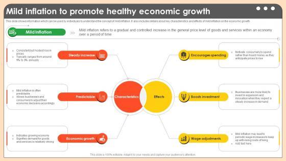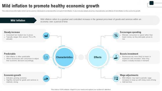 This slide shows information which can be used by individuals to understand the concept of mild inflation. It also includes details about key characteristics and effects of mild inflation on the economic growth. Do you know about Slidesgeeks Mild Inflation To Promote Healthy Economic Growth Strategies For Inflation A Tactical Guide Fin SS V These are perfect for delivering any kind od presentation. Using it, create PowerPoint presentations that communicate your ideas and engage audiences. Save time and effort by using our pre-designed presentation templates that are perfect for a wide range of topic. Our vast selection of designs covers a range of styles, from creative to business, and are all highly customizable and easy to edit. Download as a PowerPoint template or use them as Google Slides themes. This slide shows information which can be used by individuals to understand the concept of mild inflation. It also includes details about key characteristics and effects of mild inflation on the economic growth.