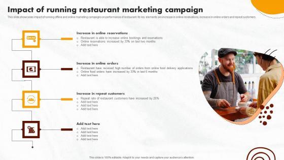 This slide showcases impact of running offline and online marketing campaigns on performance of restaurant. Its key elements are increase in online reservations, increase in online orders and repeat customers. This Online Promotional Activities Impact Of Running Restaurant Icons Pdf is perfect for any presentation, be it in front of clients or colleagues. It is a versatile and stylish solution for organizing your meetings. The Online Promotional Activities Impact Of Running Restaurant Icons Pdf features a modern design for your presentation meetings. The adjustable and customizable slides provide unlimited possibilities for acing up your presentation. Slidegeeks has done all the homework before launching the product for you. So, do not wait, grab the presentation templates today This slide showcases impact of running offline and online marketing campaigns on performance of restaurant. Its key elements are increase in online reservations, increase in online orders and repeat customers.