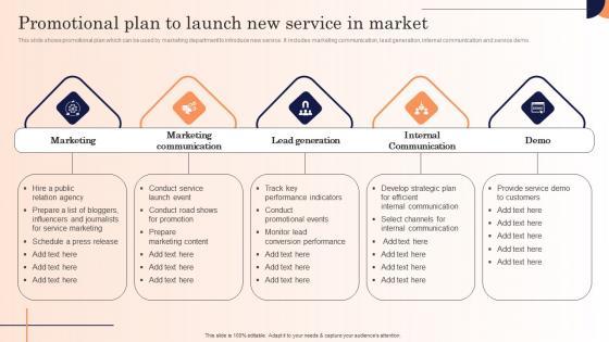This slide shows promotional plan which can be used by marketing department to introduce new service. It includes marketing communication, lead generation, internal communication and service demo.Retrieve professionally designed Promotional Plan To Launch New Service In Market Strategic Marketing Campaign Formats Pdf to effectively convey your message and captivate your listeners. Save time by selecting pre-made slideshows that are appropriate for various topics, from business to educational purposes. These themes come in many different styles, from creative to corporate, and all of them are easily adjustable and can be edited quickly. Access them as PowerPoint templates or as Google Slides themes. You do not have to go on a hunt for the perfect presentation because Slidegeeks got you covered from everywhere. This slide shows promotional plan which can be used by marketing department to introduce new service. It includes marketing communication, lead generation, internal communication and service demo.