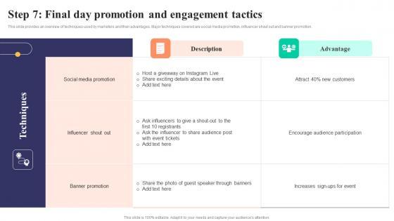 This slide provides an overview of techniques used by marketers and their advantages. Major techniques covered are social media promotion, influencer shout out and banner promotion. Want to ace your presentation in front of a live audience Our Step 7 Final Day Promotion And Engagement Tactics Professional PDF can help you do that by engaging all the users towards you. Slidegeeks experts have put their efforts and expertise into creating these impeccable powerpoint presentations so that you can communicate your ideas clearly. Moreover, all the templates are customizable, and easy to edit and downloadable. Use these for both personal and commercial use.