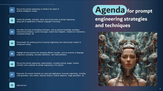 Get a simple yet stunning designed Agenda For Prompt Engineering Strategies And Techniques Brochure Pdf. It is the best one to establish the tone in your meetings. It is an excellent way to make your presentations highly effective. So, download this PPT today from Slidegeeks and see the positive impacts. Our easy-to-edit Agenda For Prompt Engineering Strategies And Techniques Brochure Pdf can be your go-to option for all upcoming conferences and meetings. So, what are you waiting for Grab this template today. Our Agenda For Prompt Engineering Strategies And Techniques Brochure PDF are topically designed to provide an attractive backdrop to any subject. Use them to look like a presentation pro.
