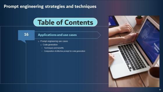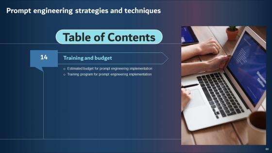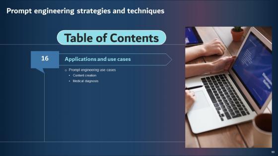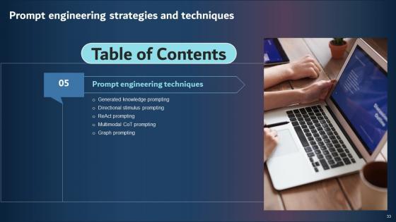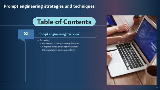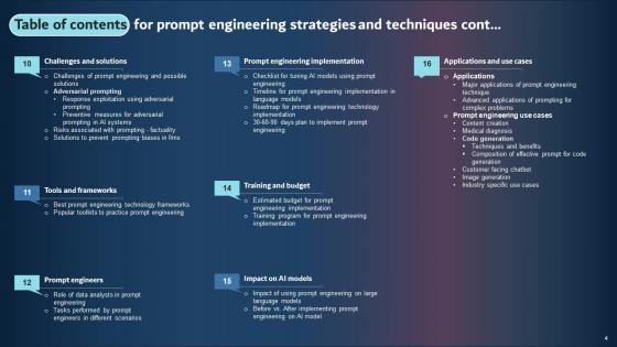 The best PPT templates are a great way to save time, energy, and resources. Slidegeeks have 100 percent editable powerpoint slides making them incredibly versatile. With these quality presentation templates, you can create a captivating and memorable presentation by combining visually appealing slides and effectively communicating your message. Download Table Of Contents For Prompt Engineering Strategies And Techniques Graphics Pdf from Slidegeeks and deliver a wonderful presentation. Our Table Of Contents For Prompt Engineering Strategies And Techniques Graphics PDF are topically designed to provide an attractive backdrop to any subject. Use them to look like a presentation pro.