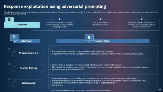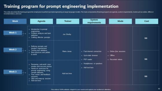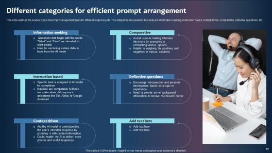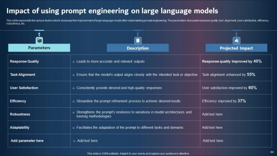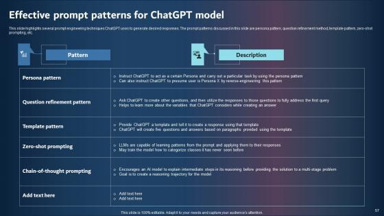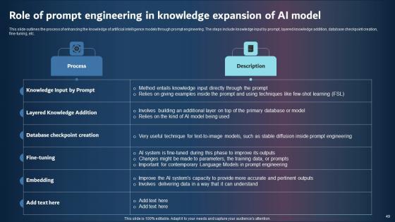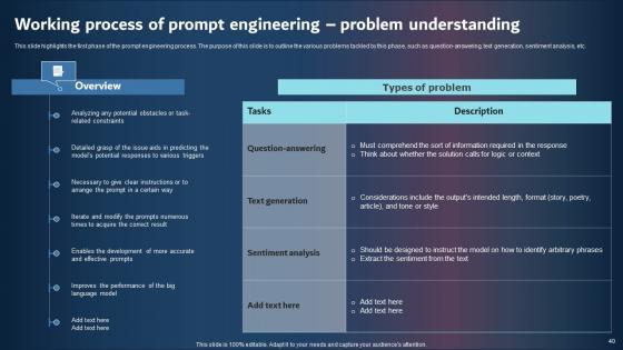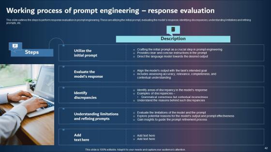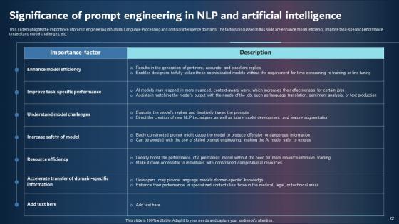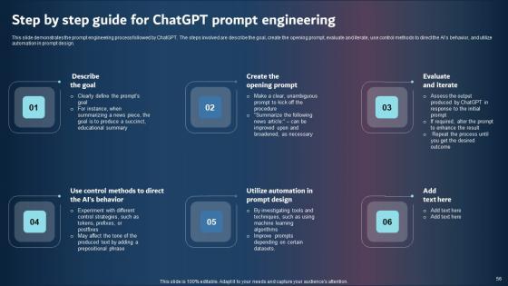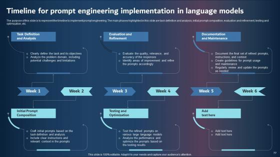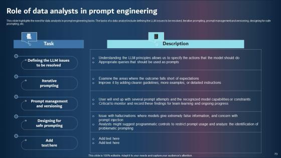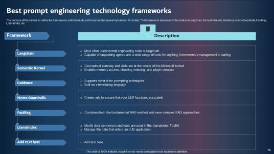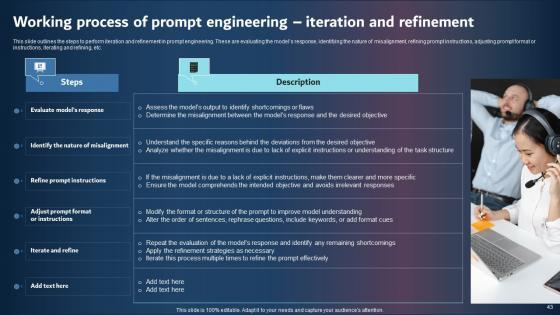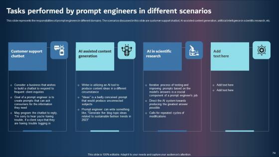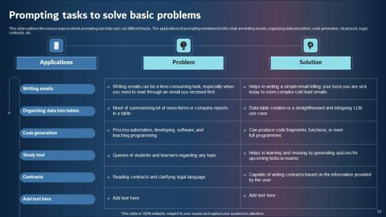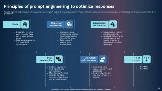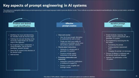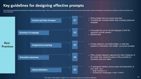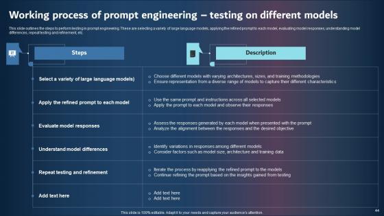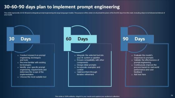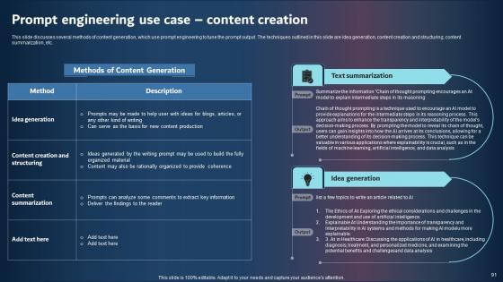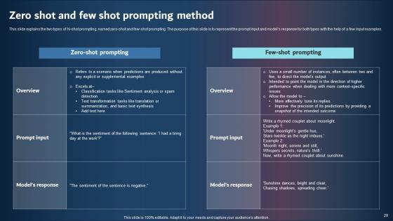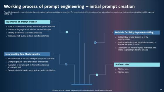 This Prompt Engineering Strategies And Techniques Ppt Powerpoint Presentation Complete Deck With Slides is a primer on how to capitalize on business opportunities through planning, innovation, and market intelligence. The content-ready format of the complete deck will make your job as a decision-maker a lot easier. Use this ready-made PowerPoint Template to help you outline an extensive and legible plan to capture markets and grow your company on the right path, at an exponential pace. What is even more amazing is that this presentation is completely editable and 100 percent customizable. This one hundred one slide complete deck helps you impress a roomful of people with your expertise in business and even presentation. Craft such a professional and appealing presentation for that amazing recall value. Download now. Our Prompt Engineering Strategies And Techniques Ppt Powerpoint Presentation Complete Deck With Slides are topically designed to provide an attractive backdrop to any subject. Use them to look like a presentation pro.