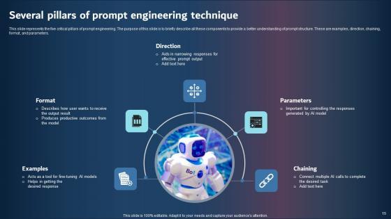 This slide represents the five critical pillars of prompt engineering. The purpose of this slide is to briefly describe all these components to provide a better understanding of prompt structure. These are examples, direction, chaining, format, and parameters. This modern and well-arranged Several Pillars Of Prompt Engineering Technique Summary Pdf provides lots of creative possibilities. It is very simple to customize and edit with the Powerpoint Software. Just drag and drop your pictures into the shapes. All facets of this template can be edited with Powerpoint, no extra software is necessary. Add your own material, put your images in the places assigned for them, adjust the colors, and then you can show your slides to the world, with an animated slide included. This slide represents the five critical pillars of prompt engineering. The purpose of this slide is to briefly describe all these components to provide a better understanding of prompt structure. These are examples, direction, chaining, format, and parameters.