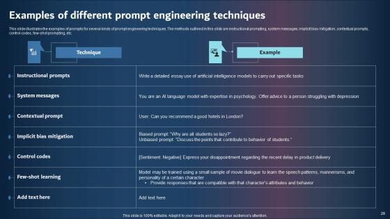 This slide illustrates the examples of prompts for several kinds of prompt engineering techniques. The methods outlined in this slide are instructional prompting, system messages, implicit bias mitigation, contextual prompts, control codes, few-shot prompting, etc. Formulating a presentation can take up a lot of effort and time, so the content and message should always be the primary focus. The visuals of the PowerPoint can enhance the presenters message, so our Examples Of Different Prompt Engineering Techniques Elements Pdf was created to help save time. Instead of worrying about the design, the presenter can concentrate on the message while our designers work on creating the ideal templates for whatever situation is needed. Slidegeeks has experts for everything from amazing designs to valuable content, we have put everything into Examples Of Different Prompt Engineering Techniques Elements Pdf. This slide illustrates the examples of prompts for several kinds of prompt engineering techniques. The methods outlined in this slide are instructional prompting, system messages, implicit bias mitigation, contextual prompts, control codes, few-shot prompting, etc.