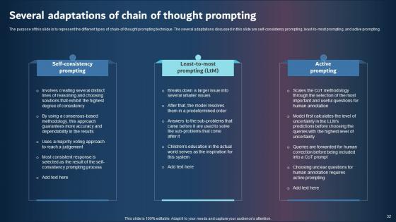 This slide showcases overview and explanation of chain of shot prompting, which prompt engineers and users can refer to increase accuracy of prompts. It provides information about initial, response, objective, etc. Slidegeeks is one of the best resources for PowerPoint templates. You can download easily and regulate Chain Of Thought Prompting Prompt Engineering Technique Crafting Interactions A Guide AI SS V for your personal presentations from our wonderful collection. A few clicks is all it takes to discover and get the most relevant and appropriate templates. Use our Templates to add a unique zing and appeal to your presentation and meetings. All the slides are easy to edit and you can use them even for advertisement purposes. This slide showcases overview and explanation of chain of shot prompting, which prompt engineers and users can refer to increase accuracy of prompts. It provides information about initial, response, objective, etc.