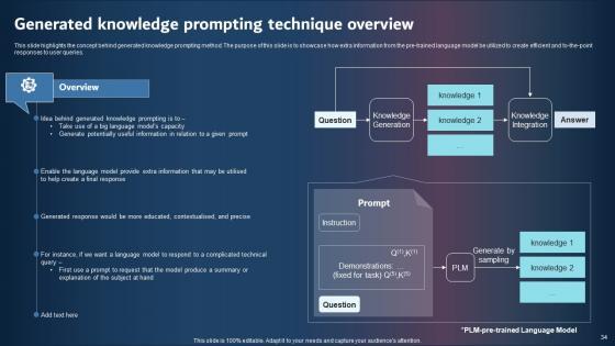 This slide showcases overview and explanation of generated knowledge prompting, which prompt engineers and users can refer to increase accuracy of prompts. It provides information about relevancy, accuracy, accurate answers, etc. Crafting an eye-catching presentation has never been more straightforward. Let your presentation shine with this tasteful yet straightforward Generated Knowledge Prompting Prompt Engineering Technique Crafting Interactions A Guide AI SS V template. It offers a minimalistic and classy look that is great for making a statement. The colors have been employed intelligently to add a bit of playfulness while still remaining professional. Construct the ideal Generated Knowledge Prompting Prompt Engineering Technique Crafting Interactions A Guide AI SS V that effortlessly grabs the attention of your audience Begin now and be certain to wow your customers This slide showcases overview and explanation of generated knowledge prompting, which prompt engineers and users can refer to increase accuracy of prompts. It provides information about relevancy, accuracy, accurate answers, etc.