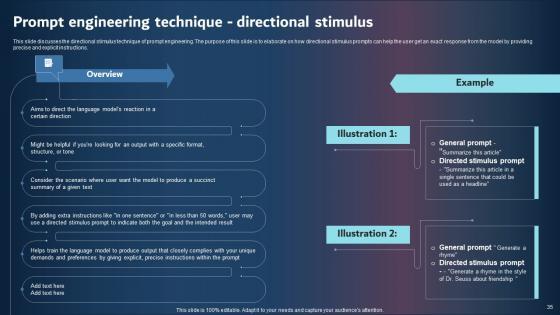 This slide discusses the directional stimulus technique of prompt engineering. The purpose of this slide is to elaborate on how directional stimulus prompts can help the user get an exact response from the model by providing precise and explicit instructions. Create an editable Prompt Engineering Technique Directional Stimulus Sample Pdf that communicates your idea and engages your audience. Whether you are presenting a business or an educational presentation, pre-designed presentation templates help save time. Prompt Engineering Technique Directional Stimulus Sample Pdf is highly customizable and very easy to edit, covering many different styles from creative to business presentations. Slidegeeks has creative team members who have crafted amazing templates. So, go and get them without any delay. This slide discusses the directional stimulus technique of prompt engineering. The purpose of this slide is to elaborate on how directional stimulus prompts can help the user get an exact response from the model by providing precise and explicit instructions.
