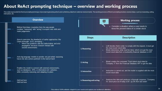 This slide showcases overview and explanation of ReAct prompting, which prompt engineers and users can refer to increase accuracy of prompts. It provides information about reasoning, acting, interaction, etc. Retrieve professionally designed React Prompting Prompt Engineering Technique Crafting Interactions A Guide AI SS V to effectively convey your message and captivate your listeners. Save time by selecting pre-made slideshows that are appropriate for various topics, from business to educational purposes. These themes come in many different styles, from creative to corporate, and all of them are easily adjustable and can be edited quickly. Access them as PowerPoint templates or as Google Slides themes. You do not have to go on a hunt for the perfect presentation because Slidegeeks got you covered from everywhere. This slide showcases overview and explanation of ReAct prompting, which prompt engineers and users can refer to increase accuracy of prompts. It provides information about reasoning, acting, interaction, etc.