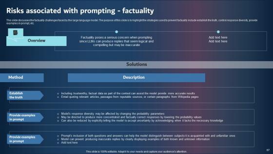 This slide describes the different types of prompt engineering methods. The critical elements of this slide are general knowledge prompting, instructional prompting, system messages, implicit bias mitigation, multiple turn interactions, contextual prompts, control codes, prompt tuning, etc. Slidegeeks has constructed Understanding Several Prompt Engineering Techniques Template Pdf after conducting extensive research and examination. These presentation templates are constantly being generated and modified based on user preferences and critiques from editors. Here, you will find the most attractive templates for a range of purposes while taking into account ratings and remarks from users regarding the content. This is an excellent jumping-off point to explore our content and will give new users an insight into our top-notch PowerPoint Templates. This slide describes the different types of prompt engineering methods. The critical elements of this slide are general knowledge prompting, instructional prompting, system messages, implicit bias mitigation, multiple turn interactions, contextual prompts, control codes, prompt tuning, etc.