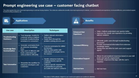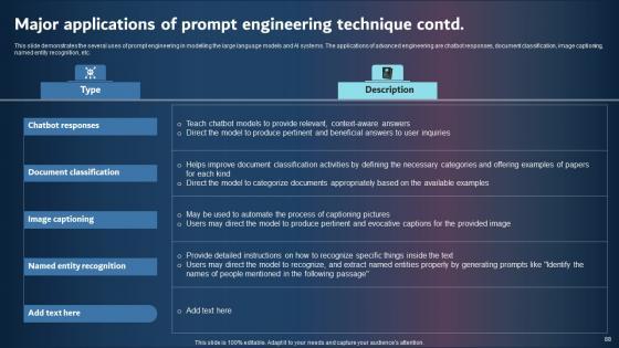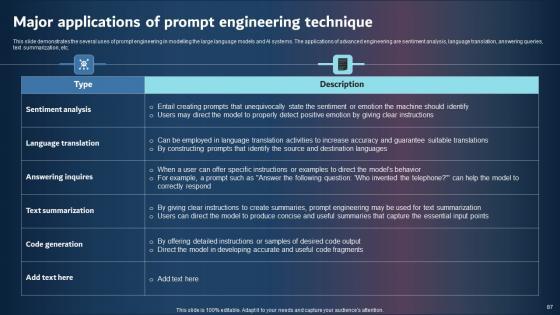 This slide demonstrates the several uses of prompt engineering in modelling the large language models and AI systems. The applications of advanced engineering are sentiment analysis, language translation, answering queries, text summarization, etc. Slidegeeks has constructed Major Applications Of Prompt Engineering Technique Summary Pdf after conducting extensive research and examination. These presentation templates are constantly being generated and modified based on user preferences and critiques from editors. Here, you will find the most attractive templates for a range of purposes while taking into account ratings and remarks from users regarding the content. This is an excellent jumping-off point to explore our content and will give new users an insight into our top-notch PowerPoint Templates. This slide demonstrates the several uses of prompt engineering in modelling the large language models and AI systems. The applications of advanced engineering are sentiment analysis, language translation, answering queries, text summarization, etc.
