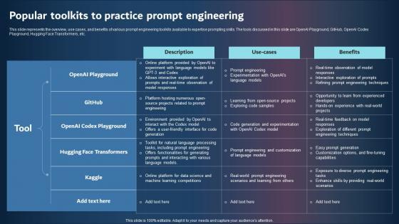 This slide represents the overview, use cases, and benefits of various prompt engineering toolkits available to expertise prompting skills. The tools discussed in this slide are OpenAI Playground, GitHub, OpenAI Codex Playground, Hugging Face Transformers, etc. This Popular Toolkits To Practice Prompt Engineering Professional Pdf from Slidegeeks makes it easy to present information on your topic with precision. It provides customization options, so you can make changes to the colors, design, graphics, or any other component to create a unique layout. It is also available for immediate download, so you can begin using it right away. Slidegeeks has done good research to ensure that you have everything you need to make your presentation stand out. Make a name out there for a brilliant performance. This slide represents the overview, use cases, and benefits of various prompt engineering toolkits available to expertise prompting skills. The tools discussed in this slide are OpenAI Playground, GitHub, OpenAI Codex Playground, Hugging Face Transformers, etc.
