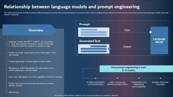 This slide represents the correlation between artificial intelligence systems and prompt engineering. The purpose of this slide is to outline various methods by which prompt engineering is used in large language models to generate effective responses. Find highly impressive Relationship Between Language Models And Prompt Engineering Elements Pdf on Slidegeeks to deliver a meaningful presentation. You can save an ample amount of time using these presentation templates. No need to worry to prepare everything from scratch because Slidegeeks experts have already done a huge research and work for you. You need to download Relationship Between Language Models And Prompt Engineering Elements Pdf for your upcoming presentation. All the presentation templates are 100 percent editable and you can change the color and personalize the content accordingly. Download now This slide represents the correlation between artificial intelligence systems and prompt engineering. The purpose of this slide is to outline various methods by which prompt engineering is used in large language models to generate effective responses.