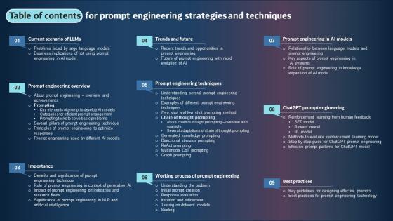 The best PPT templates are a great way to save time, energy, and resources. Slidegeeks have 100 percent editable powerpoint slides making them incredibly versatile. With these quality presentation templates, you can create a captivating and memorable presentation by combining visually appealing slides and effectively communicating your message. Download Table Of Contents For Prompt Engineering Strategies And Techniques Graphics Pdf from Slidegeeks and deliver a wonderful presentation. Our Table Of Contents For Prompt Engineering Strategies And Techniques Graphics PDF are topically designed to provide an attractive backdrop to any subject. Use them to look like a presentation pro.