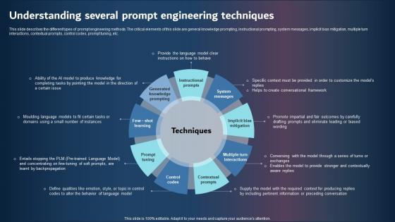 This slide describes the different types of prompt engineering methods. The critical elements of this slide are general knowledge prompting, instructional prompting, system messages, implicit bias mitigation, multiple turn interactions, contextual prompts, control codes, prompt tuning, etc. Slidegeeks has constructed Understanding Several Prompt Engineering Techniques Template Pdf after conducting extensive research and examination. These presentation templates are constantly being generated and modified based on user preferences and critiques from editors. Here, you will find the most attractive templates for a range of purposes while taking into account ratings and remarks from users regarding the content. This is an excellent jumping-off point to explore our content and will give new users an insight into our top-notch PowerPoint Templates. This slide describes the different types of prompt engineering methods. The critical elements of this slide are general knowledge prompting, instructional prompting, system messages, implicit bias mitigation, multiple turn interactions, contextual prompts, control codes, prompt tuning, etc.