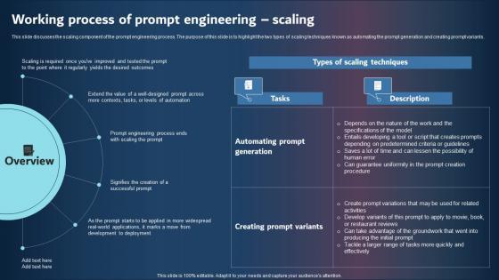 This slide discusses the scaling component of the prompt engineering process. The purpose of this slide is to highlight the two types of scaling techniques known as automating the prompt generation and creating prompt variants. Do you know about Slidesgeeks Working Process Of Prompt Engineering Scaling Graphics Pdf These are perfect for delivering any kind od presentation. Using it, create PowerPoint presentations that communicate your ideas and engage audiences. Save time and effort by using our pre-designed presentation templates that are perfect for a wide range of topic. Our vast selection of designs covers a range of styles, from creative to business, and are all highly customizable and easy to edit. Download as a PowerPoint template or use them as Google Slides themes. This slide discusses the scaling component of the prompt engineering process. The purpose of this slide is to highlight the two types of scaling techniques known as automating the prompt generation and creating prompt variants.