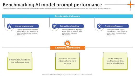 This slide showcases benchmarking prompt engineering performance, referable by users and multiple businesses harnessing this technology. It provides information about internal, external, performance tracking, etc. Create an editable Benchmarking AI Model Prompt Performance Crafting Interactions A Guide AI SS V that communicates your idea and engages your audience. Whether you are presenting a business or an educational presentation, pre-designed presentation templates help save time. Benchmarking AI Model Prompt Performance Crafting Interactions A Guide AI SS V is highly customizable and very easy to edit, covering many different styles from creative to business presentations. Slidegeeks has creative team members who have crafted amazing templates. So, go and get them without any delay. This slide showcases benchmarking prompt engineering performance, referable by users and multiple businesses harnessing this technology. It provides information about internal, external, performance tracking, etc.