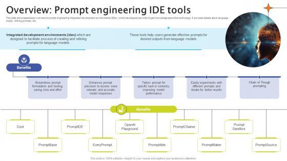This slide showcases basic overview to prompt engineering integrated development environments IDEs which developers can refer to gain knowledge about this technology. It provides details about language model, refining prompts, etc. Here you can discover an assortment of the finest PowerPoint and Google Slides templates. With these templates, you can create presentations for a variety of purposes while simultaneously providing your audience with an eye-catching visual experience. Download Overview Prompt Engineering IDE Tools Crafting Interactions A Guide AI SS V to deliver an impeccable presentation. These templates will make your job of preparing presentations much quicker, yet still, maintain a high level of quality. Slidegeeks has experienced researchers who prepare these templates and write high-quality content for you. Later on, you can personalize the content by editing the Overview Prompt Engineering IDE Tools Crafting Interactions A Guide AI SS V. This slide showcases basic overview to prompt engineering integrated development environments IDEs which developers can refer to gain knowledge about this technology. It provides details about language model, refining prompts, etc.