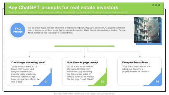 This slide showcases ChatGPT prompts which can help investors explore multiple use cases in real estate. It provides details about FAQ cash buyer, how it works, compare two options, etc. Take your projects to the next level with our ultimate collection of Transforming Real Estate Key ChatGPT Prompts For Real Estate Investors ChatGPT SS V. Slidegeeks has designed a range of layouts that are perfect for representing task or activity duration, keeping track of all your deadlines at a glance. Tailor these designs to your exact needs and give them a truly corporate look with your own brand colors they will make your projects stand out from the rest This slide showcases ChatGPT prompts which can help investors explore multiple use cases in real estate. It provides details about FAQ cash buyer, how it works, compare two options, etc.