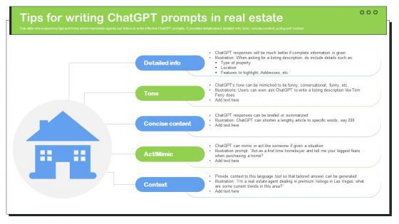 This slide showcases key tips and tricks which real estate agents can follow to write effective ChatGPT prompts. It provides details about detailed info, tone, concise content, acting and context. Get a simple yet stunning designed Transforming Real Estate Tips For Writing ChatGPT Prompts In Real Estate ChatGPT SS V. It is the best one to establish the tone in your meetings. It is an excellent way to make your presentations highly effective. So, download this PPT today from Slidegeeks and see the positive impacts. Our easy-to-edit Transforming Real Estate Tips For Writing ChatGPT Prompts In Real Estate ChatGPT SS V can be your go-to option for all upcoming conferences and meetings. So, what are you waiting for Grab this template today. This slide showcases key tips and tricks which real estate agents can follow to write effective ChatGPT prompts. It provides details about detailed info, tone, concise content, acting and context.